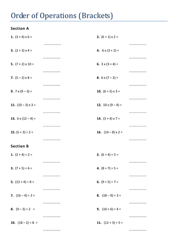 Order of Operations Worksheets - Math-Drills This page includes Order of Operations worksheets using whole numbers, integers, decimals and fractions. Elementary and middle school students generally use the acronyms PEMDAS or BEDMAS to help them remember the order in which they complete multi-operation questions. The 'P' or 'B' in the acronym stands for parentheses or brackets.